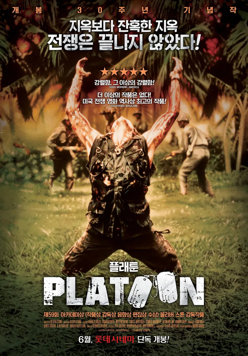 영화 플래툰은 베트남 전쟁을 다룬 영화 중 최고의 명작으로 꼽히며 올리버스톤 감독의 대표작으로 평가받는 작품이다. 필자는 이영화를 30주년을 기념해 재개봉한 2017년에 보게 되었다. 참고로 올리버스톤 감독은 실제 베트남전에 참전하였던 경험이 있다고 한다. 이 때문이지 이 영화 특유의 생생한 느낌을 느낄 수 있었다. 아무래도 직접 경험한 사람을 연출을 맡아서 그렇지 않나 싶다. 하지만 제작사 오라이언 픽처스나 배급을 맡았던 콜롬비아 픽쳐 스는 처음에 이영화를 크게 기대하지 않았었다고 한다. 그 당시만 해도 감독으로서의 명성이 없었던 올리버 스톤에 배우들도 이렇게까지 영화가 성공할 줄은 몰랐다고들 한다. 영화 플레툰은 감독이 베트남 전쟁 경험자라 그런지 베트남전쟁의 불편한 상황을 잘 재현했는데 그중에서도 많은 화제가 된 것은 베트남전에서 벌어진 군인들의 하극상이다. 하지만 필자는 가감 없는 이러한 연출이 더욱더 이영화를 명작 반열에 올려놓은 요인이 아닌가 싶다. 전체적으로 영화적인 완성도가 매우 뛰어나고 왜 올리버스톤 감독의 대표작인지 충분히 알 수 있는 영화이다. 특히 베트남전쟁에서 낮에는 주민이었다가 밤이 되면 베트콩이 되어 적군이 되는 전투원과 민간이의 구분이 어려운 상황에 민간인을 학살하는 문제등 인간으로서 생각해야 될 많은 문제를 던져주었다. 전쟁영화로서 아주 훌륭한 작품이라 하겠다.